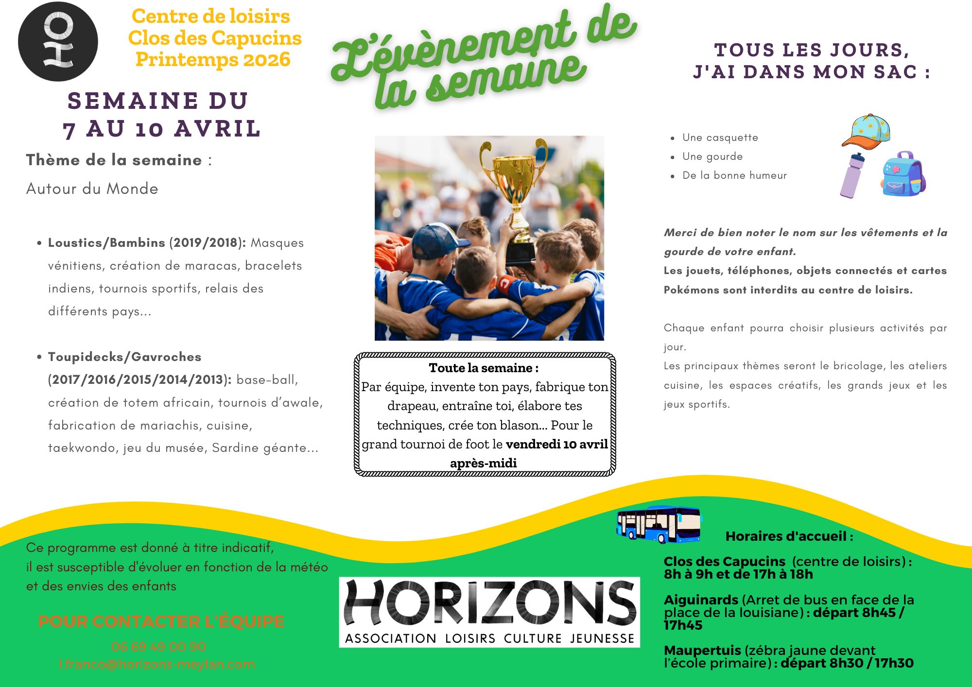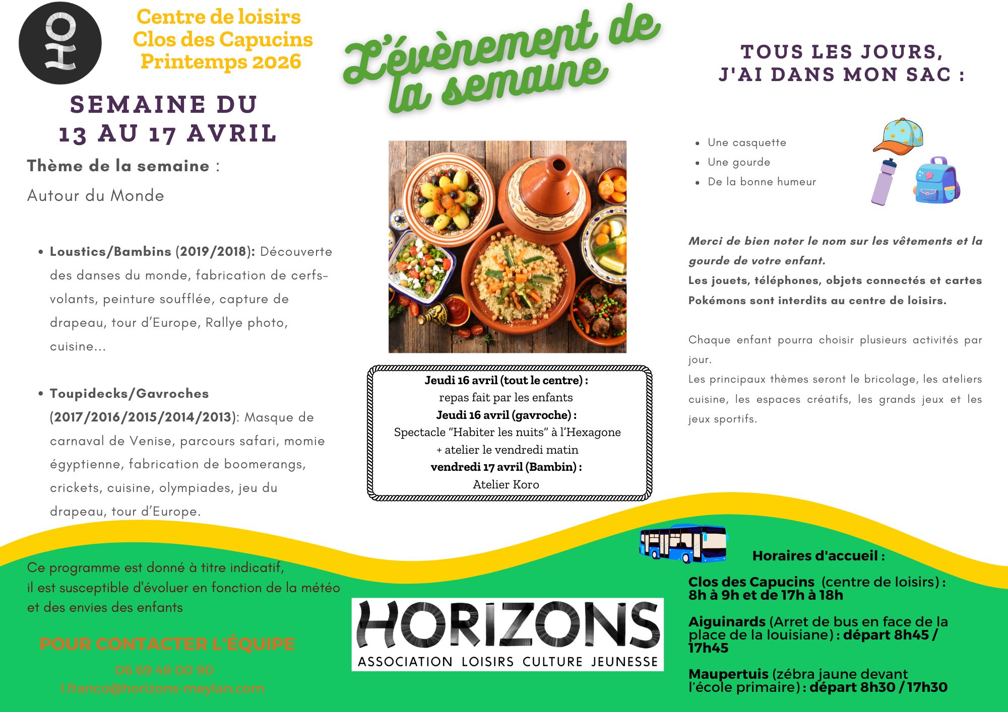 - Toute inscription pour les vacances se fait au secrétariat d’Horizons aux horaires d’ouverture uniquement, au plus tard le mercredi 11 jours avant la semaine de présence.
