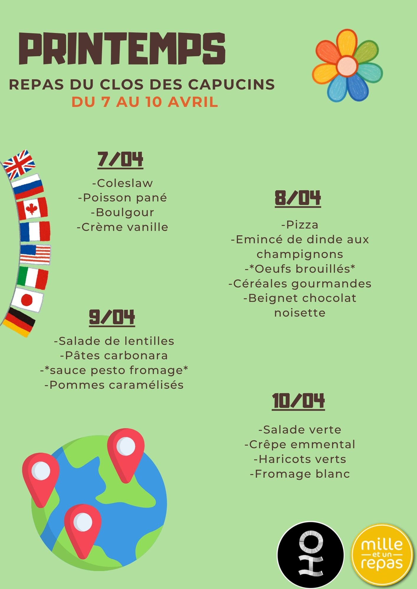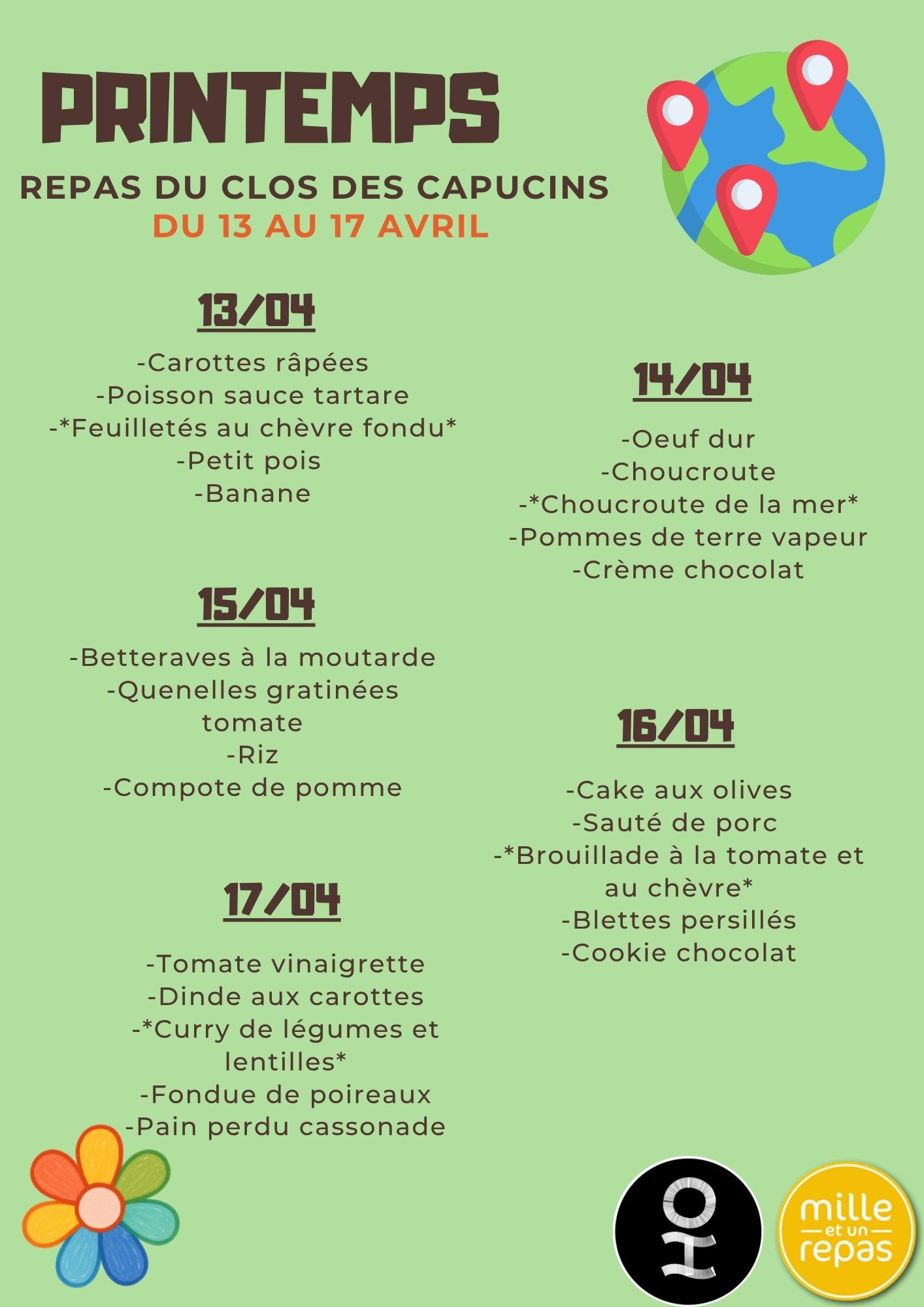 Les repas sont préparés et livrés, en liaison froide, par « Mille et un repas », gastronomie collective, qui assure une prestation de qualité.