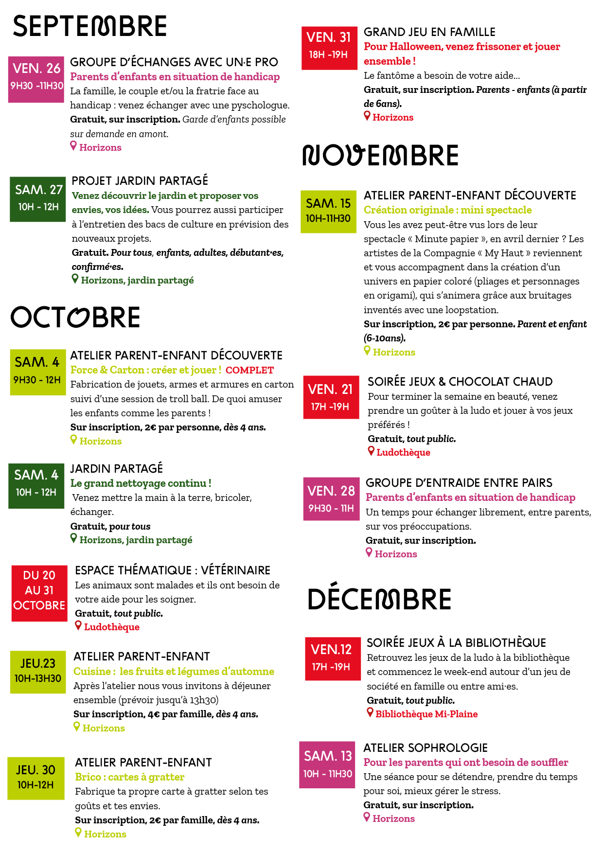 Avec les parents, en fonction de leurs envies, et dans un esprit convivial et collectif, nous organisons des temps qui permettent d'échanger, d'apprendre et de faire ensemble.